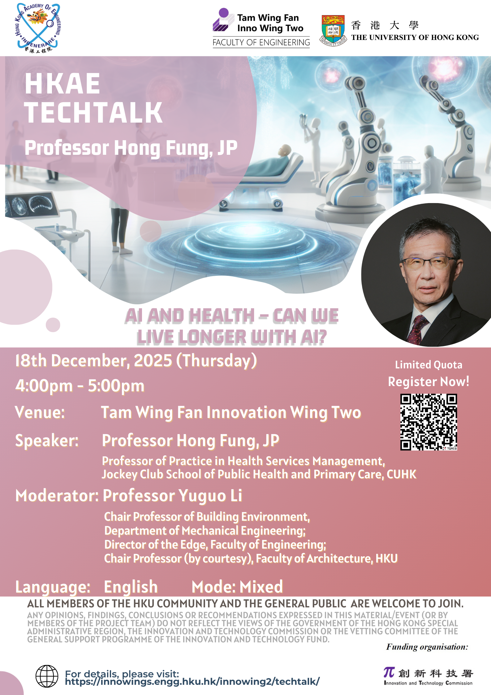 Prof. FUNG Hong will be delivering a talk on the intriguing subject of "AI and Health - Can we live longer with AI?"💡